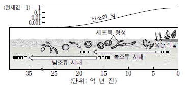 그림은 지질 시대 동안 대기 중 산소의 양과 생물의 변화를 나타낸 것이다.