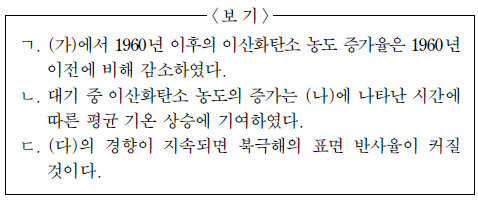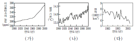 그림 (가)와 (나)는 지난 100 년 동안의 지구 대기 이산화탄소 농도와 평균 기온을 각각 나타낸 것이고, (다)는 1979 년부터 2005 년까지의 북극해 얼음 면적을 나타낸 것이다.