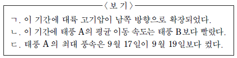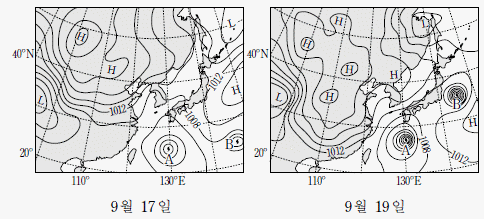 그림은 어느 해 9 월에 이틀 간격으로 작성된 지상 일기도이다.