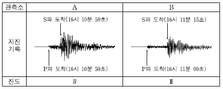 [과목 구분 없음] 그림은 어느 지진이 발생했을 때 두 관측소 A와 B에서 관측한 지진 기록과 진도를 나타낸 것이다.