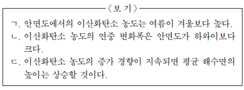 [과목 구분 없음] 그림은 우리나라 안면도와 미국 하와이에서 관측한 대기 중 이산화탄소의 농도를 시간에 따라 나타낸 것이다.