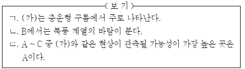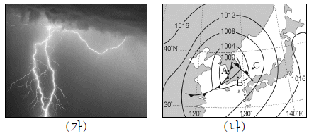 그림 (가)는 어느 날 발생한 뇌우의 모습을, (나)는 이때 우리나라 주변의 지상 일기도를 나타낸 것이다.
