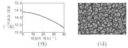 그림(가)는 태양의 위도에 따른 자전각 속도를, (나)는 광구의 쌀알무늬를 나타낸 것이다.
