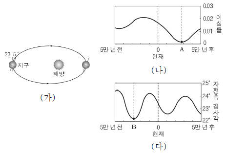 그림 (가)는 현재 지구 자전축의 방향과 공전 궤도면을, (나)와 (다)는 현재를 기준으로 5만 년 전~5만 년 후의 지구 공전 궤도 이심률과 지구 자전축 경사각의 변화를 나타낸 것이다.