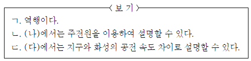 그림 (가)는 일정 기간 동안 관측한 화성의 시운동을, (나)와 (다)는 각각 프톨레마이오스와 코페르니쿠스의 우주관을 나타낸 것이다.