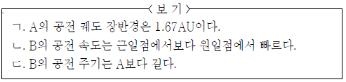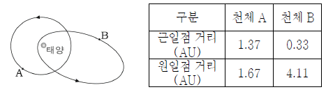 그림은 두 천체의 공전 궤도를, 표는 태양으로부터 두 천체 궤도의 근일점과 원일점까지의 거리를 나타낸 것이다.