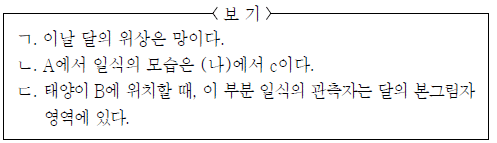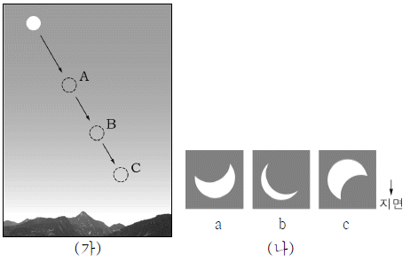 그림 (가)는 북반구 중위도 지역에서 부분일식이 일어난 날 태양의 이동 경로를 나타낸 것이고, (나)의 a, b, c는 A, B, C 위치에서의 일식 모습을 순서 없이 나열한 것이다.