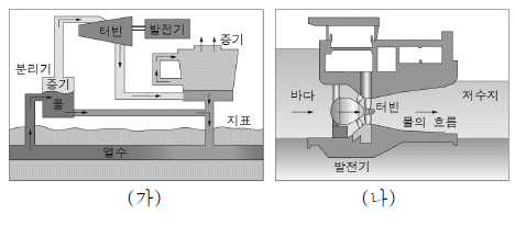 그림 (가)와 (나)는 서로 다른 에너지원을 이용한 발전 원리를 나타낸 것이다.