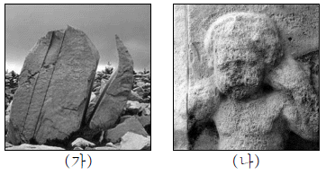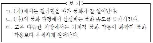 그림 (가)는 기계적 풍화 작용의 예를, (나)는 화학적 풍화 작용의 예를 나타낸 것이다.