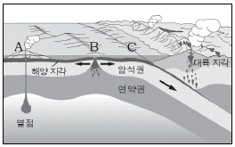 그림은 판의 경계와 주변 지형을 나타낸 것이다.