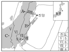 그림은 2011년 일본 동쪽 해상에서 발생한 지진의 진앙과 진도 분포를 나타낸 것이다.