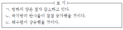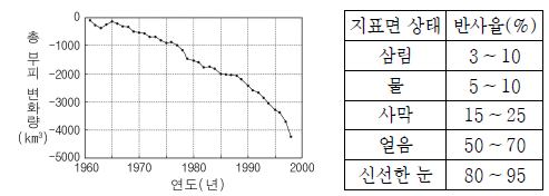 그림은 1960년을 기준으로 나타낸 전 세계 빙하의 총 부피 변화량이며, 표는 지표면 상태에 따른 반사율을 나타낸 것이다.