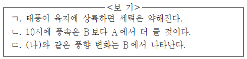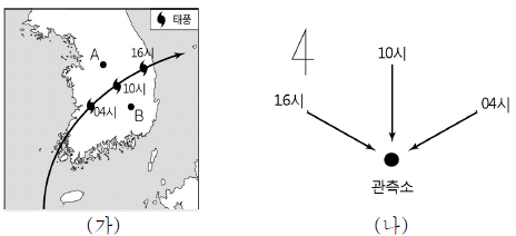 그림 (가)는 어느 태풍의 이동 경로를, (나)는 A, B 중 한 관측소에서 시간에 따른 풍향 변화를 나타낸 것이다.