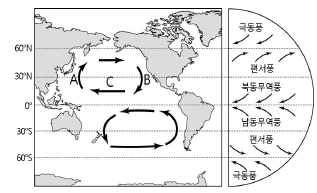 그림은 태평양 표층의 아열대 순환과 대기 대순환을 나타낸 것이다.