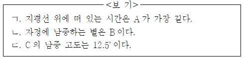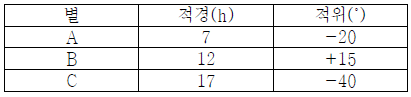 표는 춘분날 서울 지방(37.5˚ N)에서 관측한 별들의 적경과 적위를 나타낸 것이다.