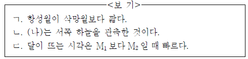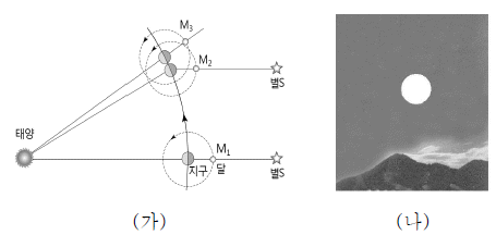 그림 (가)는 태양, 지구, 달의 상대적 위치 관계를, (나)는 M1의 달을 초저녁에 인천에서 관측한 것이다.
