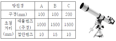 다음은 세 망원경의 규격과 망원경 A의 모습을 나타낸 것이다.