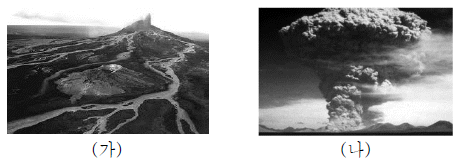 그림은 성질이 다른 두 용암에 의한 화산의 분출 모습이다.