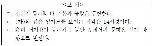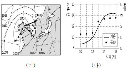 그림 (가)는 어느 날 우리나라 주변의 지상 일기도를, (나)는 이 날 관측소 A 에서 측정한 기온과 풍향을 나타낸 것이다.