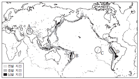그림은 진원의 깊이에 따른 지진의 진앙 분포와 주요 변동대 A~D를 나타낸 것이다.