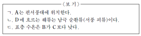 그림은 남태평양의 주요 표층 해류가 흐르는 해역 A~D를 나타낸 것이다.