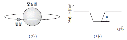 그림 (가)는 어느 외계 행성이 별 주위를 공전하는 모습을, (나)는 이 별의 겉보기 밝기를 시간에 따라 나타낸 것이다.