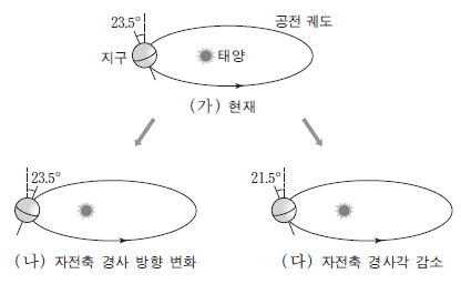 그림은 지구 자전축의 변화를 현재와 비교하여 나타낸 모식도 이다.
