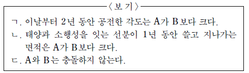 소행성 A와 B에 대한 설명으로 옳은 것만을 <보기>에서 있는 대로 고른 것은? [3점]