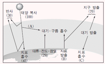 그림은 복사 평형을 이루고 있는 지구의 에너지 출입을 나타낸 모식도이다.