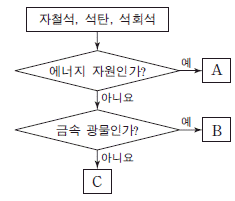 그림은 자철석, 석탄, 석회석을 특징에 따라 구분하는 과정을 나타낸 것이다.