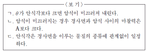 [과목 구분 없음] 그림은 경사면에 놓인 암석에 작용 하는 힘(→)을 나타낸 것이다.