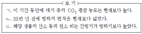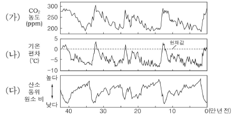 [과목 구분 없음] 그림 (가)와 (나)는 남극의 빙하 연구를 통해 알아낸 과거 42만 년 동안의 대기 중 CO2 농도와 기온 편차를, (다)는 해양 생물의 껍질에서 측정한 이 기간 동안의 산소 동위 원소 비를 나타낸 것이다.