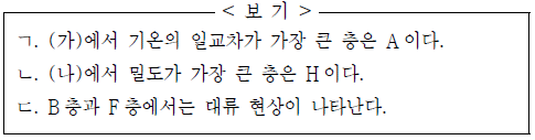 그림 (가)는 기권의 높이에 따른 기온 분포를, (나)는 지구 내부의 층상 구조를 나타낸 것이다.