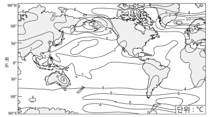 그림은 대기 중 이산화탄소의 양이 현재의 2배가 되었을 때 기온 변화 예상도이다.