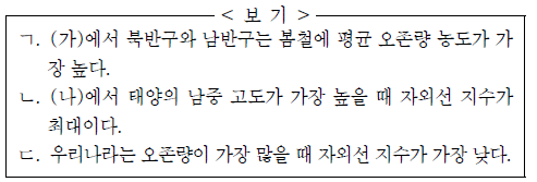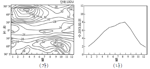 그림 (가)는 위도에 따른 월별 총 오존량 분포를, (나)는 우리 나라의 월별 자외선 지수를 나타낸 것이다.