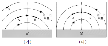 그림 (가)와 (나)는 위도가 다른 북반구의 두 지역에서 관측한 별의 일주 운동을 나타낸 것이다.