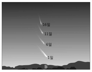 그림은 태양 주변을 공전하는 어느 혜성을 5일 간격으로 해뜨기 직전에 관측하여 합성한 것이다.