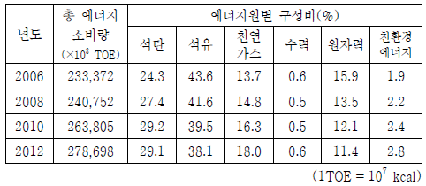 표는 우리나라의 총 에너지 소비량과 그에 따른 에너지원별 구성비를 나타낸 것이다.