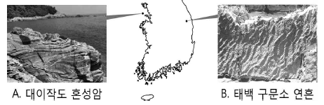 그림은 우리나라의 두 지역에서 관찰되는 암석의 모습이다.
