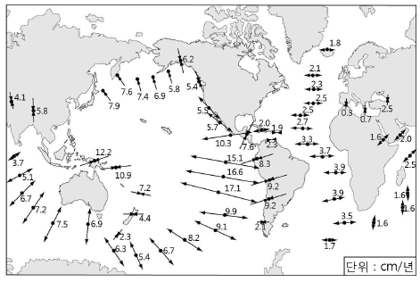 그림은 판의 이동 방향과 속도를 나타낸 것이다.