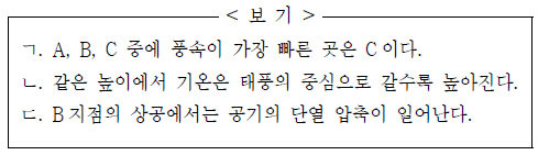 이에 대한 설명으로 옳은 것만을 <보기>에서 있는 대로 고른 것은? (단, 태풍 중심 B로부터 A와 C까지의 거리는 같다.) [3점]