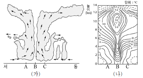 그림 (가)는 중위도에서 북상하는 어느 태풍의 단면을, (나)는 이 태풍 내부와 주변과의 기온 편차를 나타낸 것이다.