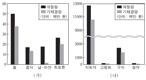 그림 (가)와 (나)는 2011년에 발표된 우리나라 주요 광석의 양을 금속과 비금속으로 구분하여 순서 없이 나타낸 것이다.