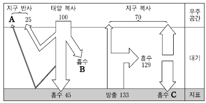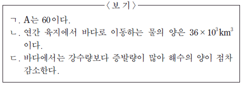 표는 물수지 평형을 이루고 있는 지구 전체의 연평균 증발량과 강수량을 육지와 바다로 구분하여 나타낸 것이다.