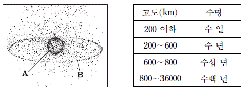 그림은 지구 주위에 있는 우주 쓰레기의 분포를, 표는 우주 쓰레기의 고도에 따른 수명을 나타낸 것이다. 그림에서 우주 쓰레기 A는 약 400km, B는 약 35000km 고도에 위치한다.