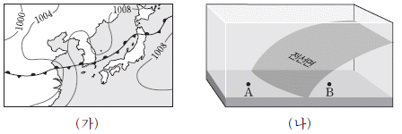 그림 (가)는 우리나라 주변의 초여름 일기도이고, (나)는 (가)의 일기도에서 전선면의 모습을 나타낸 모식도이다.
