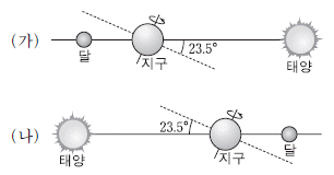 그림 (가)와 (나)는 보름달이 관측되는 어느 하짓날과 동짓날의 모습을 순서 없이 나타낸 것이다.