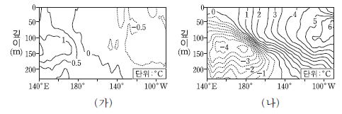 그림 (가)와 (나)는 서로 다른 두 시기에 태평양 적도 부근 해역의 깊이에 따른 수온 편차(관측 수온-평균 수온) 분포를 나타낸 것이다.