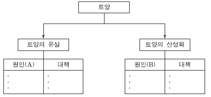 그림은 토양의 유실과 산성화의 원인과 대책을 정리하기 위한 도표이다.