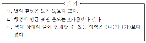그림 (가)와 (나)는 질량이 서로 다른 두 중심별의 생명 가능 지대와 행성 A, B의 공전 궤도를 나타낸 것이다.